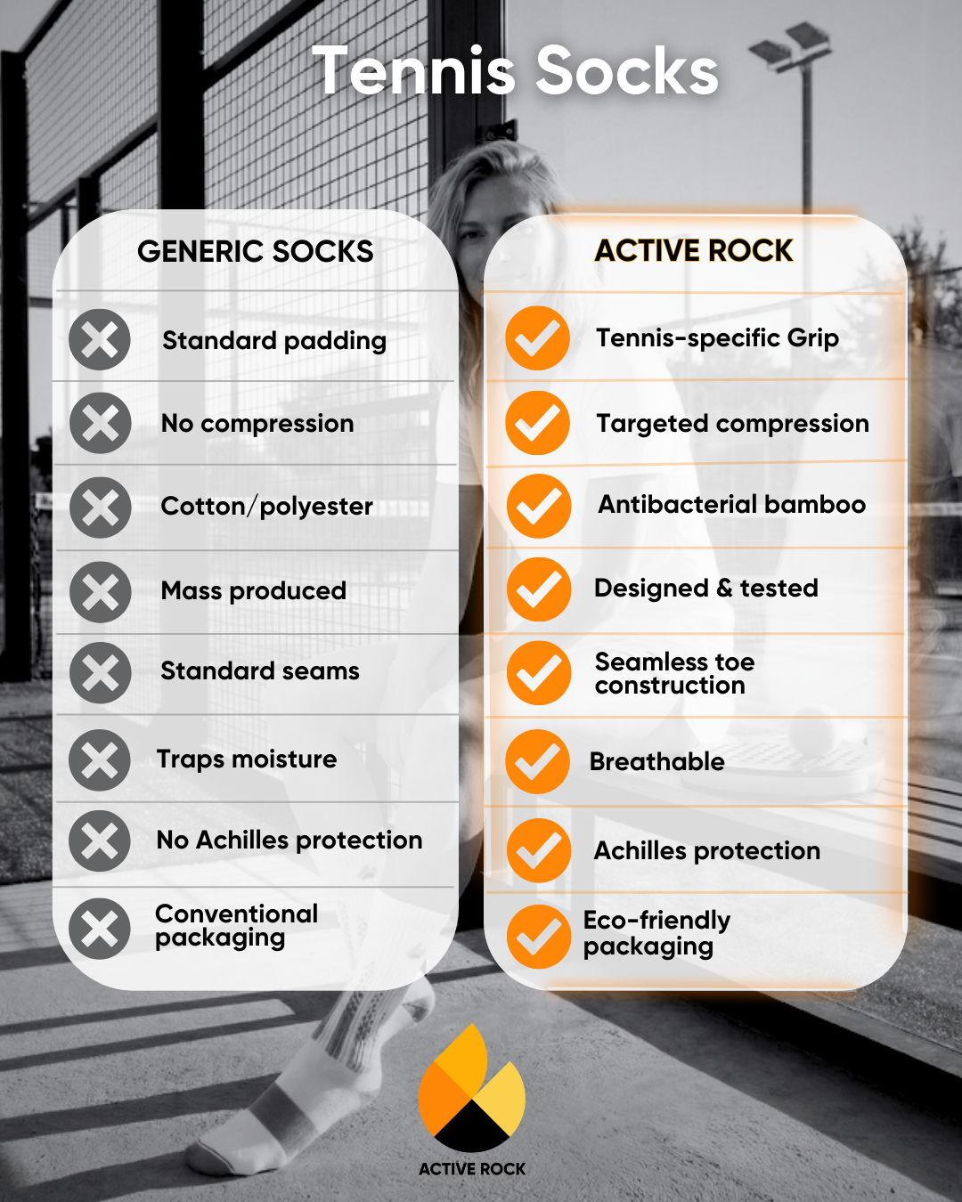 Entdecken Sie den Unterschied von Active Rock – unsere Tennissocken sind für Sportler mit höchsten Ansprüchen entwickelt. Im Gegensatz zu herkömmlichen Modellen bieten Active Rock Tennissocken sportspezifischen Grip, gezielte Kompression und antibakteriellen Tragekomfort aus Bambus.